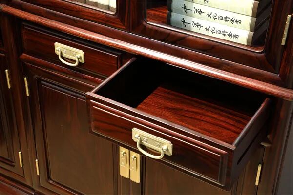 《景程书柜》体态方正,仿佛一位温文尔雅的君子,静静地伫立在书房一隅。它充分考虑了实用功能的需求,采用了收纳柜格、抽屉和开放层相结合的设计,不仅能够满足收纳图书、文具等物品的需求,还能够展示一些珍藏的艺术品或装饰品。