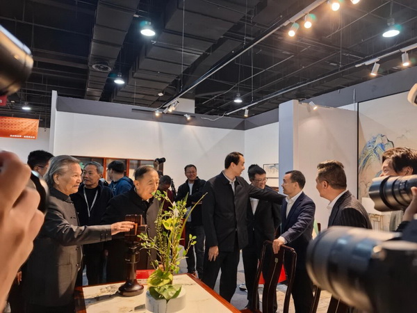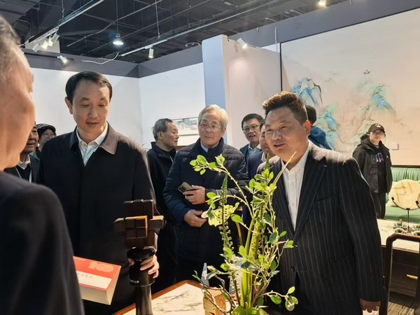杨志明部长(左二),张健市长(左三),黄胜可书记(右二),国家级非物质文化遗产项目东阳木雕代表性传承人、中国工艺美术大师陆光正(左一)参观李忠信红木展区,为企业点赞