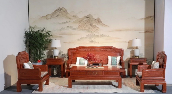 李忠信红木「鸿运来」系列全系甄选优质刺猬紫檀为核心主材,家具通体呈现出细腻的浅红棕木色,天然木纹如流云般舒展,深浅交错的纹理取代了繁复雕饰,成为最本真的装饰语言。匠人对木材的打磨细致入微,沙发扶手、桌椅边角处触之温润无毛刺,既保留了刺猬紫檀耐磨、稳定的材质特性,又让每一件家具都带着自然的温度,在灯光下泛着内敛的光泽,尽显中式家具“材美工巧”的精髓。